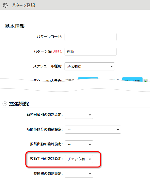「夜勤」パターンに、「夜勤手当」を強制設定する。