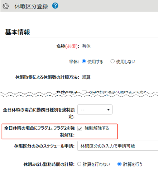 休暇の日に割り当てたい汎用フラグがある場合は、事前に該当する休暇区分内で下図の チェックを外してください。
