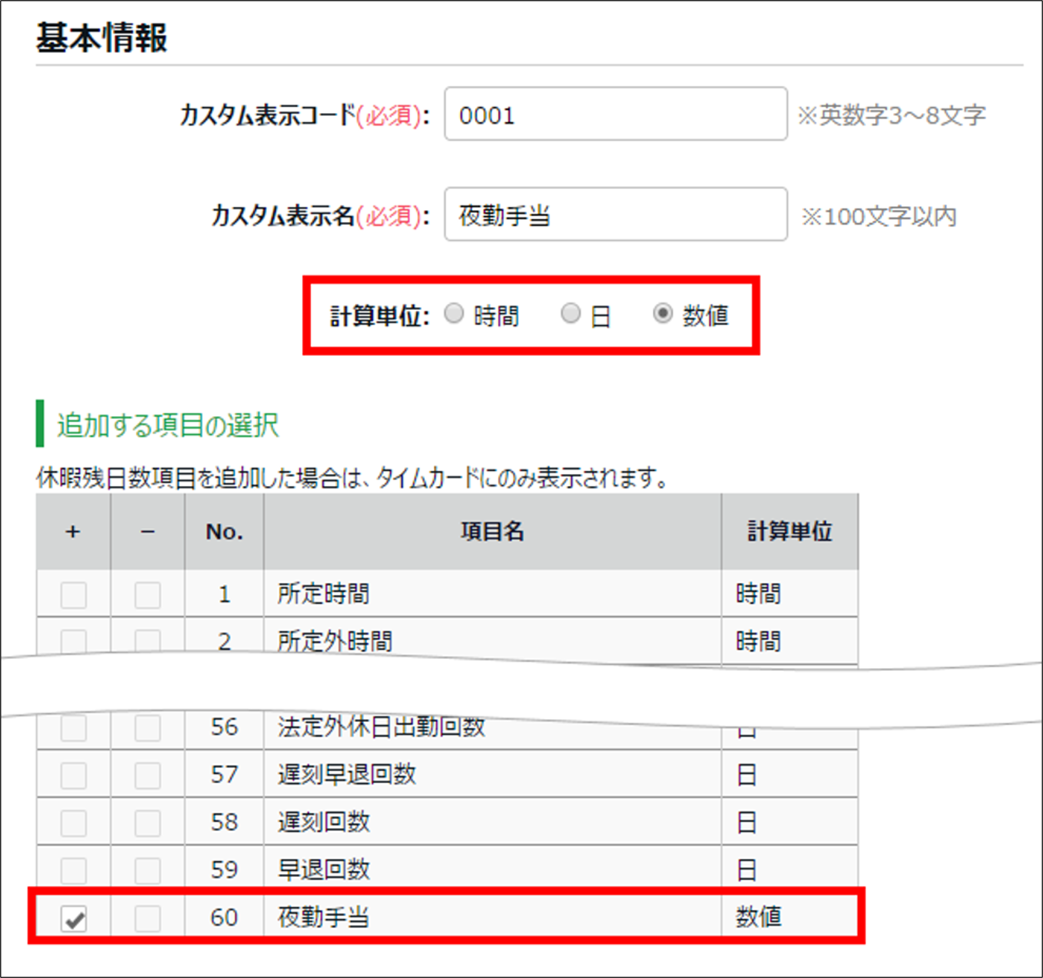 「追加する項目の選択」内、カウントしたい項目名の「+」列にチェックを入れ、登録します。