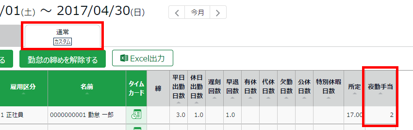 上記の例では、それぞれ「夜勤」パターンを割り当てた場合に「夜勤手当」カウントが1追加され、