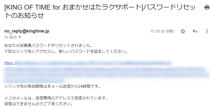 件名:[KING OF TIME for おまかせはたラクサポート]パスワードリセットのお知らせ
