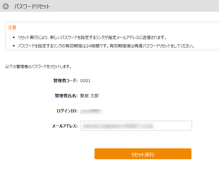送信先のメールアドレスを確認し、[リセット実行]をクリックします。
