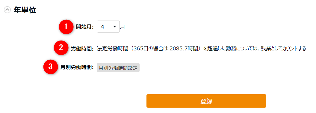 3 | 月別基準時間 | [月別労働時間設定]ボタンをクリックし、各月の「休日日数」「労働時間」と「特定期間」を設定します |