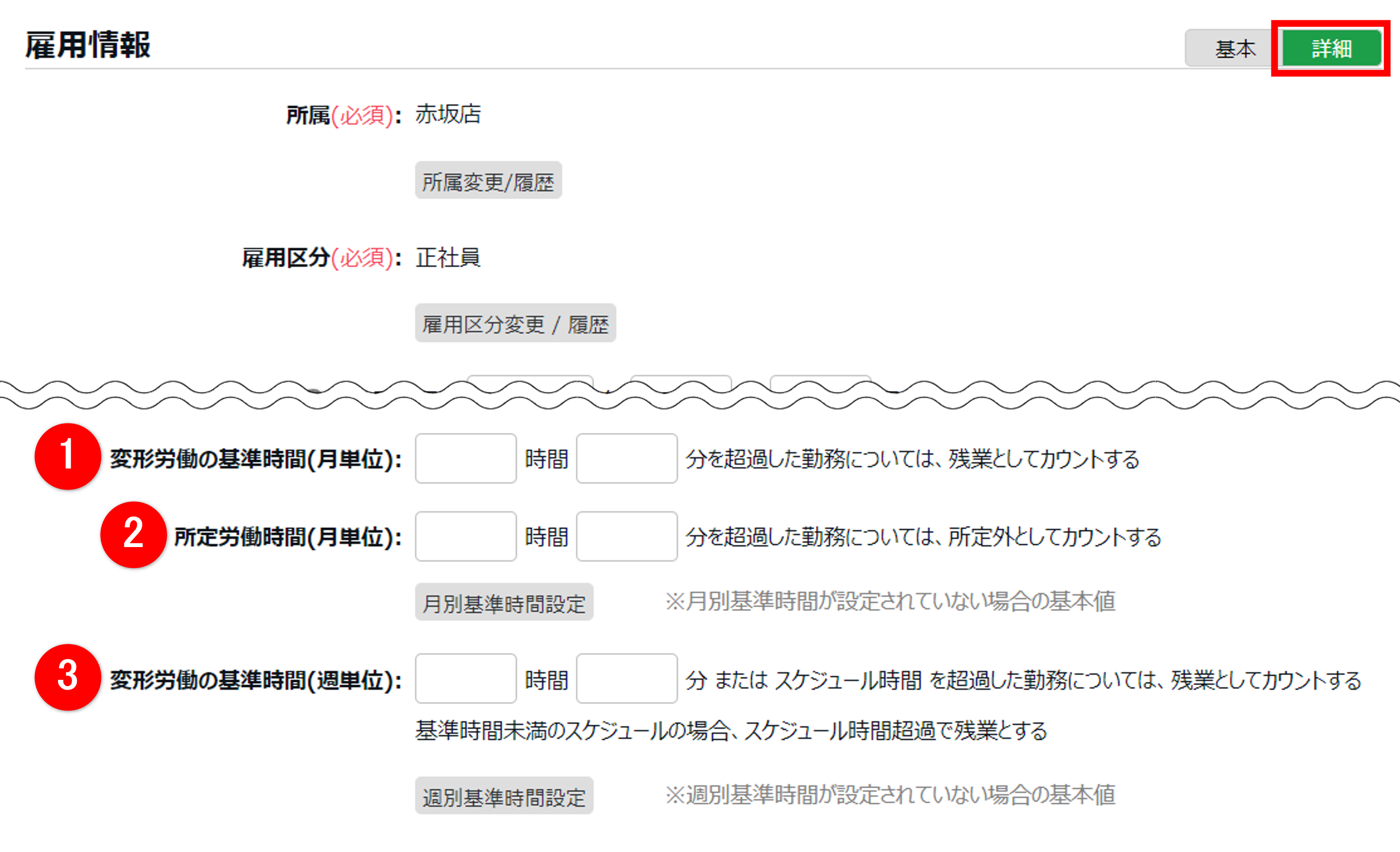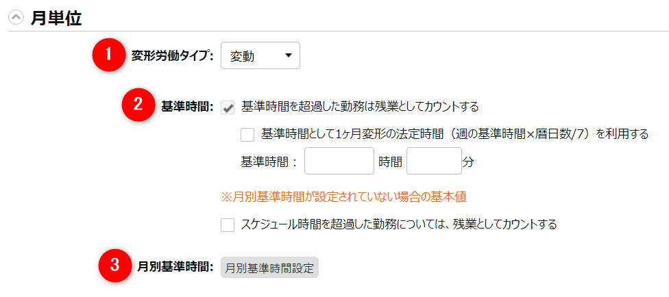 3 | 月別基準時間 | 「変形労働タイプ」項目で「変動」または「フレックス」を選択し、かつ「基準時間」項目で「基準時間として1ヶ月変形の法定時間(週の基準時間×暦日数/7)を利用する」のチェックを入れていない場合に設定可能になります。[月別基準時間設定]ボタンをクリックし、各月の労働基準時間を設定します。 |