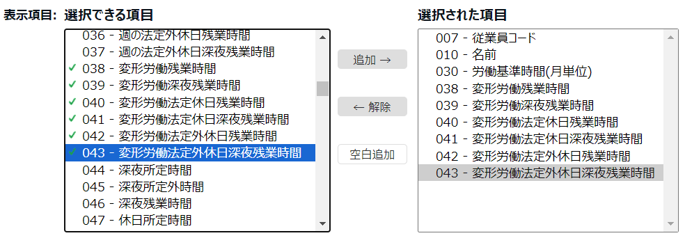 管理画面ホーム > よく使うメニュー > [エクスポートインポート] > データ出力(エクスポート)カテゴリ内の、「月別データ[CSV]」や「タイムカード[PDF]」の各出力レイアウトに、以下の項目を追加することで、変形労働によって計上された残業だけを確認できます。