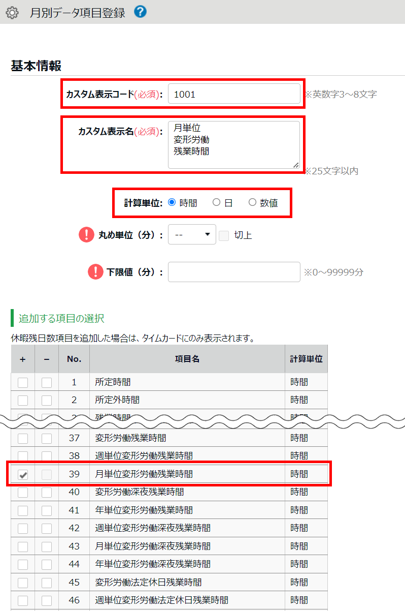 2 | 対象項目 | 変形労働の対象となる勤怠時間を選択します。選択した項目の1週間または1ヶ月の合算時間と基準時間を比較し、基準時間を超えた時間を以下の通りに計上します。 |
