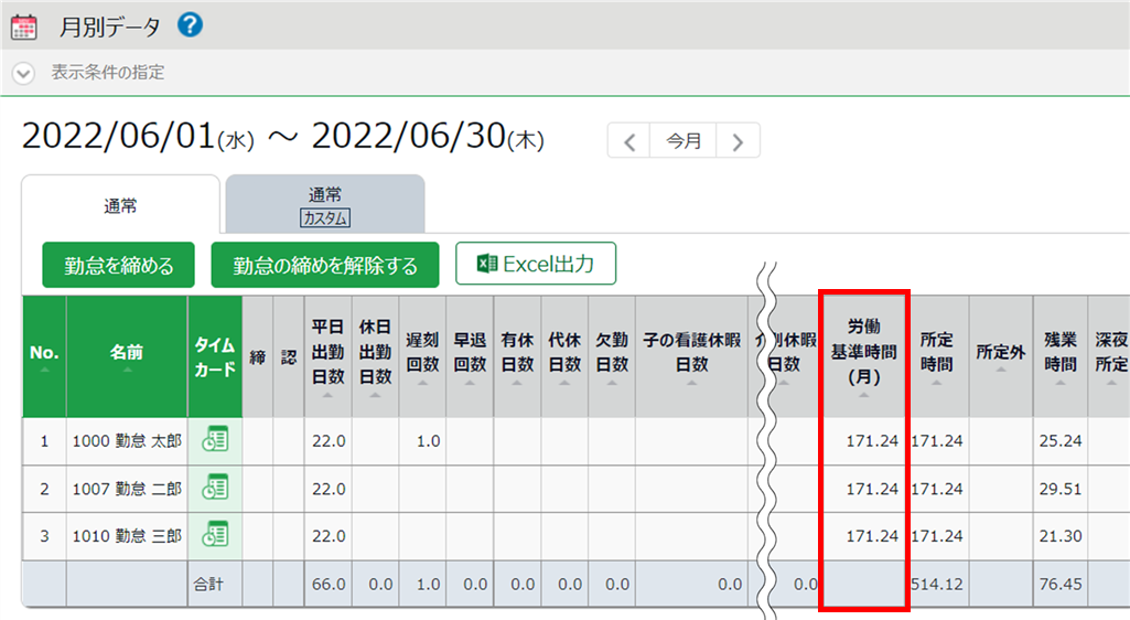 このため、変形労働が設定されている場合は、日別データの累計値と月別データの値が一致しない場合があります。ご注意ください。