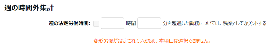変形労働設定画面を入力して登録すると、週の時間外集計カテゴリ内の「週の法定労働時間」の設定が自動的に外れ、未設定の状態になります。変形労働設定機能と「週の法定労働時間」項目とは同時に設定できないためです。