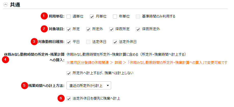 5 | 残業時間への計上方法 | 複数の対象項目を設定した場合(所定と所定外など)に影響する項目です。対象項目の労働合計が基準時間を超えた際に、どの項目から残業時間に計上するかを選択します。 時系列で計上 直近の所定外から計上 それぞれの集計方法の詳しい解説はこちらの記事をご参照ください。 |