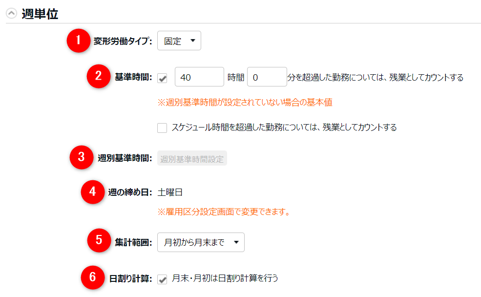 5 | 集計範囲 | 1週間が月をまたぐ場合の計算方法です。 アカウント発行時の初期値は「月初から月末まで」となっています。 利用環境によっては「前月を含める」という選択肢が表示される場合があります。前月の最終週を含めて1週間を集計範囲とします。 |