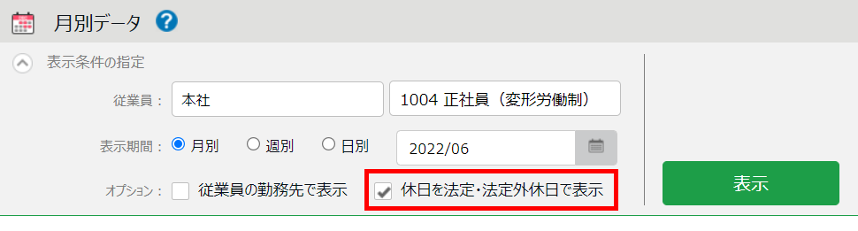 1. 月別データ画面の表示オプションに「休日を法定・法定外休日で表示」が表示されている