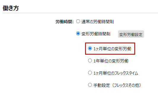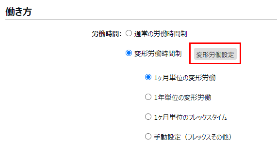 1. 「1ヶ月単位の変形労働」を選択した後、[変形労働設定]をクリックします。