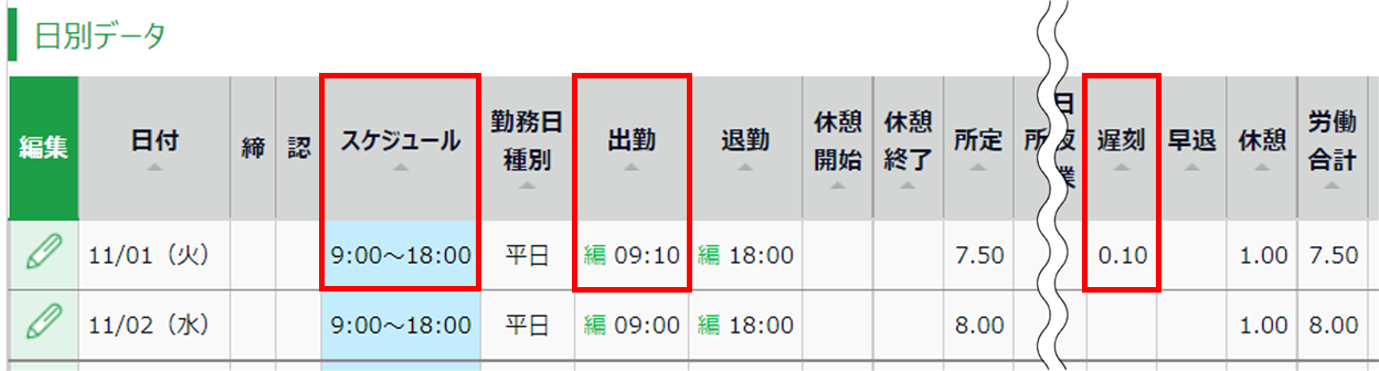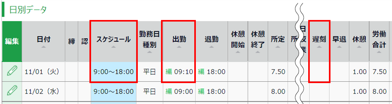 例)出勤予定 09:00 出勤打刻 09:10 → 10分の遅刻