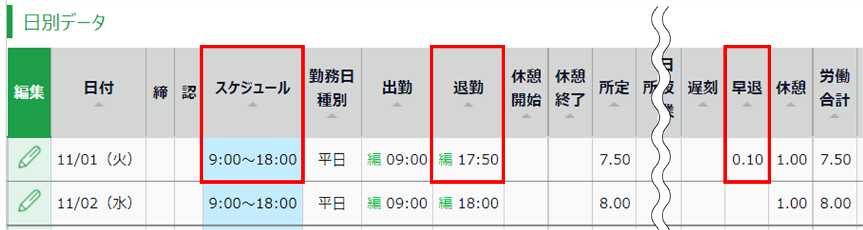 雇用区分の設定による休憩やタイムカードの「休憩予定時間」で休憩を設定している場合、早退時間に休憩時間は反映されず、退勤打刻と退勤予定の差分がそのまま計上されます。