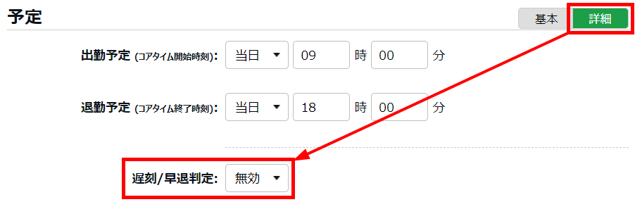 2. 予定カテゴリの[詳細] > 遅刻/早退判定 で、「無効」を選択して登録します。