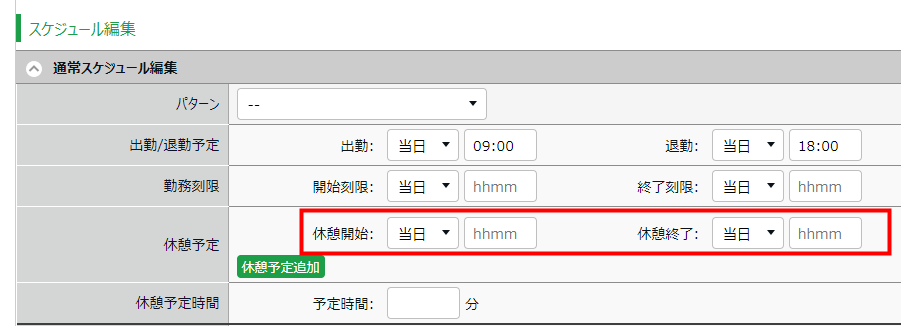 休憩時間を除いて早退時間を計上したい場合は、該当従業員のタイムカード >該当日を[編集]> スケジュール編集 > 休憩予定 より、休憩時間をご設定ください。