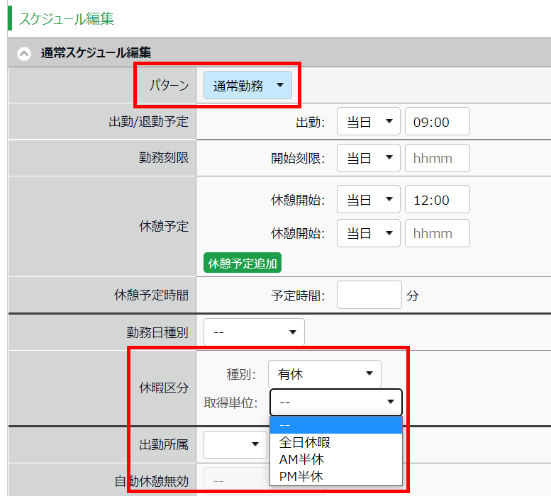 「パターン」欄で「通常勤務パターン」を選択し、「休暇区分」欄で