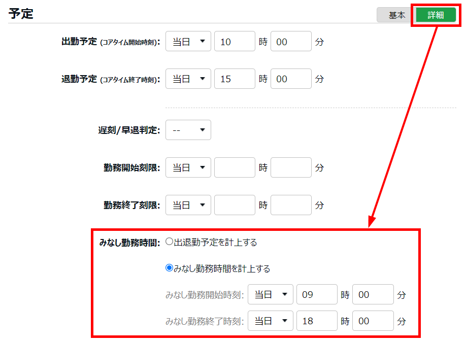 フレックス勤務など、出勤/退勤予定(コアタイム開始/終了時刻)とみなし勤務時間が一致しない場合などに利用します。