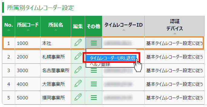 1. 設定 > 組織 > タイムレコーダー設定 を開き、所属別タイムレコーダー設定の、その他[≡]から、[タイムレコーダーURL送信]を選択します。
