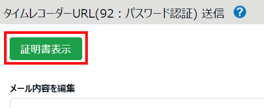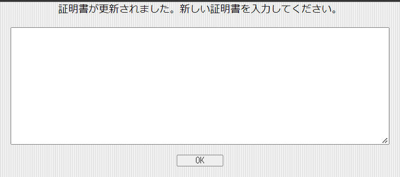 タイムレコーダーURLにアクセスすると、「証明書が更新されました。新しい証明書を入力してください。」というメッセージが表示されます。
