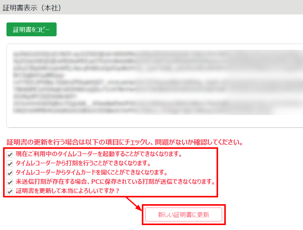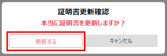 3. 確認項目をすべてお読みください。問題なければチェックを入れ、[新しい証明書に更新]をクリックします。