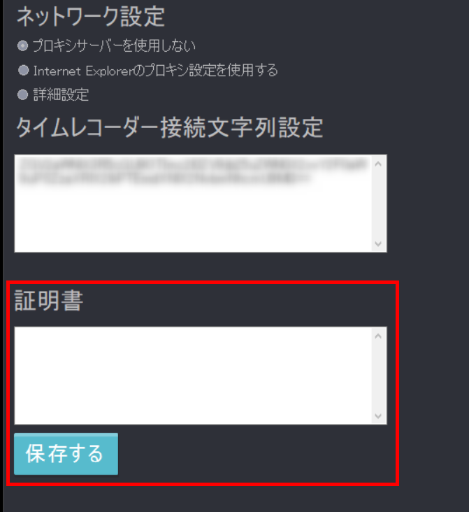 2. [OK]をクリックすると、証明書の入力画面になります。新しい証明書を入力して[保存する]をクリックすると、タイムレコーダーを起動できます。