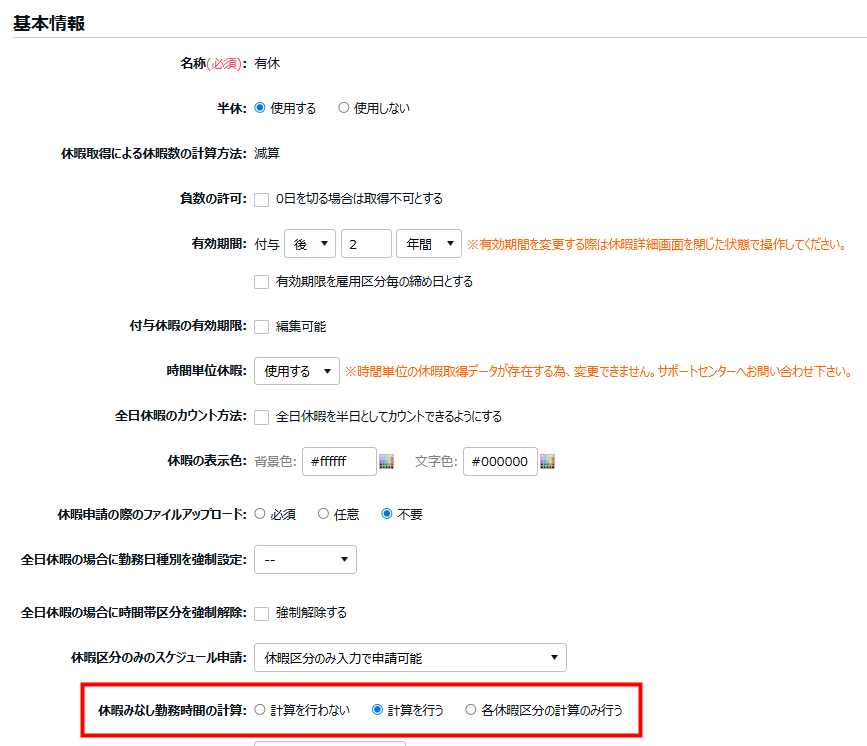 1. 設定 > スケジュール > 休暇区分設定 > 該当区分の[編集] > 休暇みなし勤務時間の計算で「計算を行う」か「各休暇区分の計算のみ行う」を選択します。