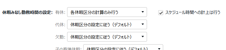 また、「各休暇区分の計算のみ行う」を選択すると、「スケジュール時間への計上は行う」を設定できるようになります。この設定により、変形労働制やフレックス制の基準時間、残業開始時間を「スケジュール時間」で設定している場合でも、休暇取得時に「スケジュール時間」を変動しないようにすることが可能です。