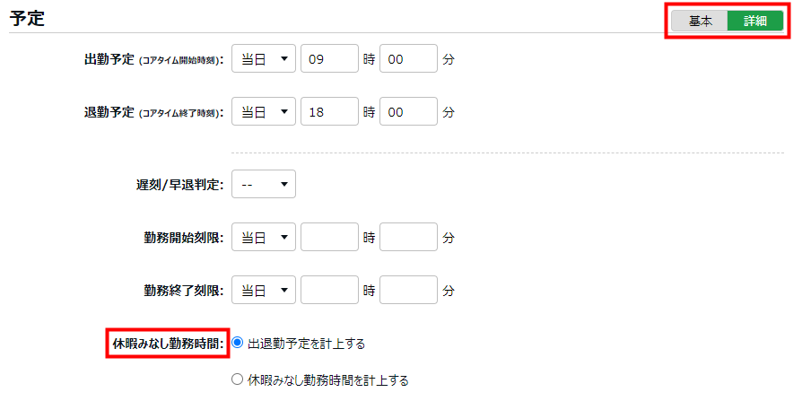 休暇みなし勤務時間を計上する | 出退勤予定時刻とは別の時間帯を、休暇みなし勤務時間として計上します。選択すると、休暇みなし勤務開始/終了時刻の入力欄が表示されます。 フレックス勤務などで、出退勤予定時刻(コアタイム)が休暇みなし勤務時間と一致しない場合はこちらを使用します。 |