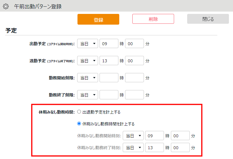 3. 同様に、午後出勤パターン登録の[設定] > 午前半休みなし勤務時間を入力し、登録します。