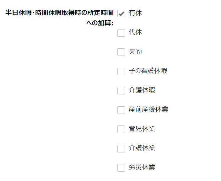 出退勤予定を計上する | 出退勤予定時刻を休暇みなし勤務時間として計上します。こちらを選択する場合は、パターン内の「出勤予定」と「退勤予定」を必ず入力してください。 |