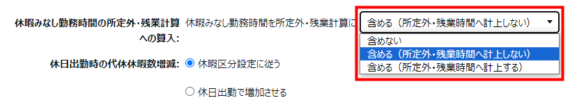 5. その下の項目「休暇みなし勤務時間の残業計算への算入」も続けて設定します。