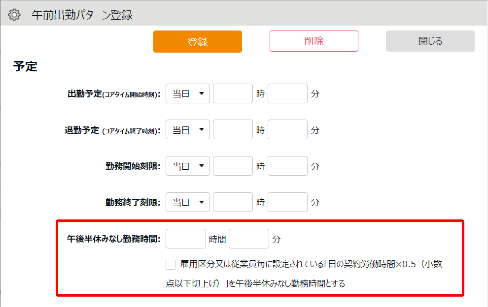 2. 設定 > スケジュール > パターン設定 > 勤務パターン(「通常勤務」など)の[編集] > 半日勤務カテゴリ > 午前出勤パターン登録の[設定] > 午後半休みなし勤務時間を入力します。