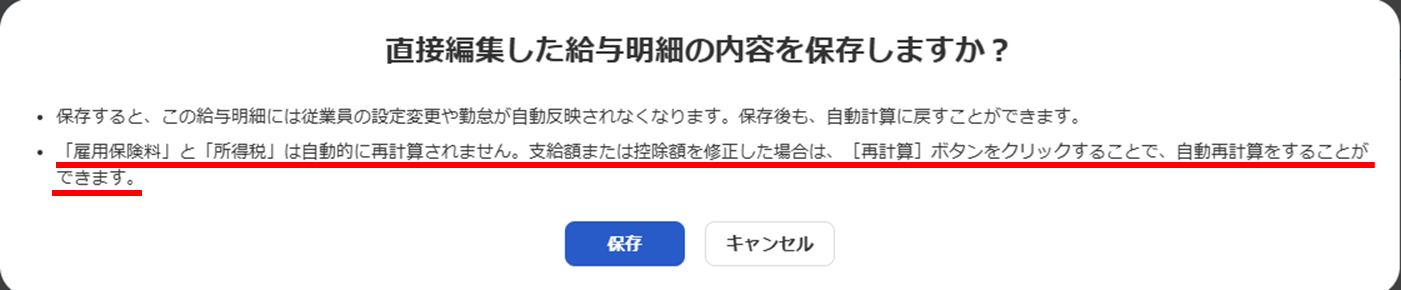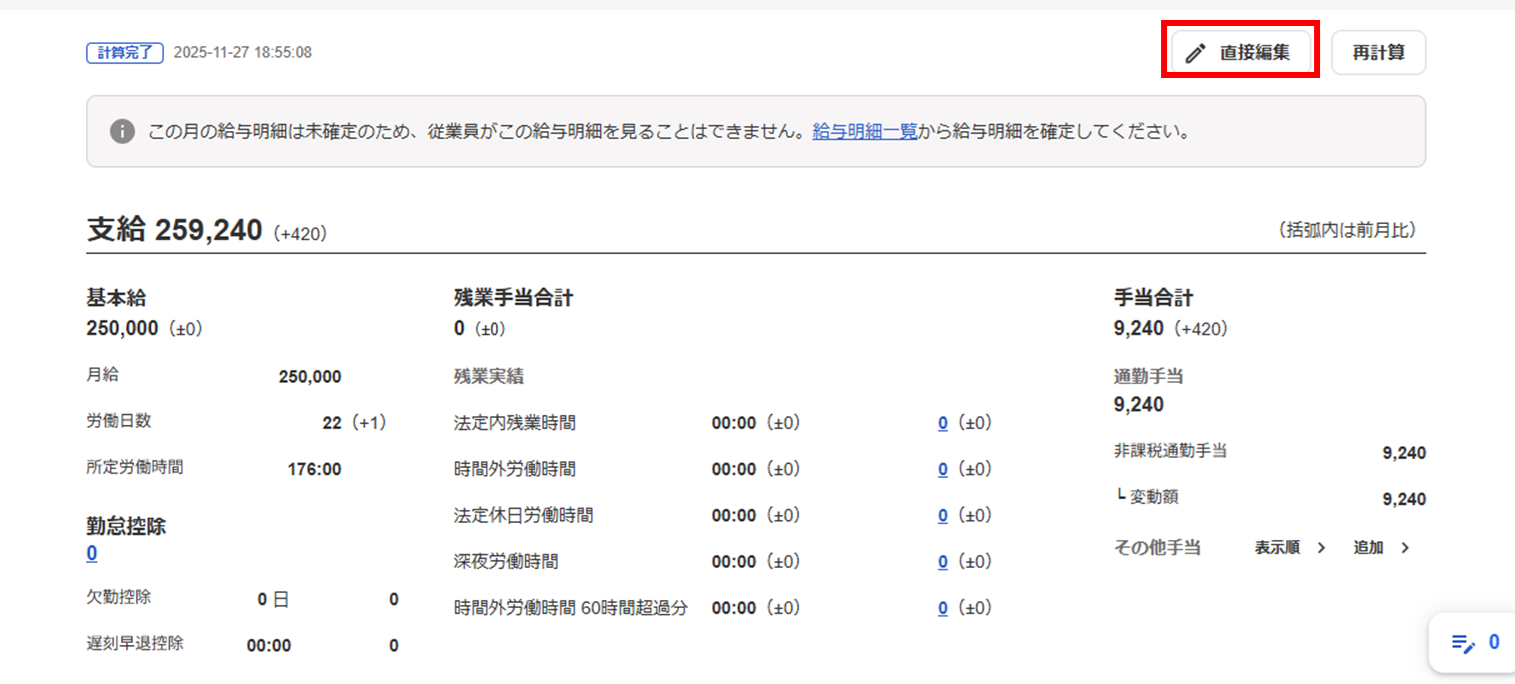 ※直接編集された給与明細は、従業員の設定変更や勤怠は自動反映されませんのでご注意ください。