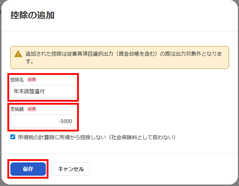 ※この時、所得税の計算時に所得から控除しない(社会保険料として扱わない)のチェックは入れたままとします。