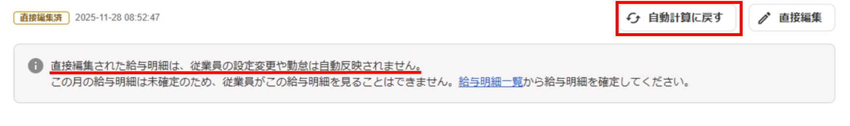 直接編集を行った給与明細は直接編集のボタンを押すことで自動計算に戻すことも可能です。