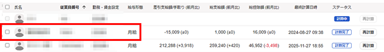 2,給与明細一覧より還付対象の従業員をクリックします。