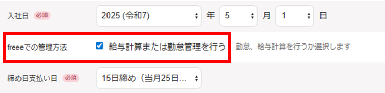 freeeで勤怠管理または給与計算を行う場合、✔の入った状態にします。