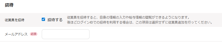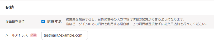 入力すると、従業員登録の完了時に従業員へ招待メールが送信されます。