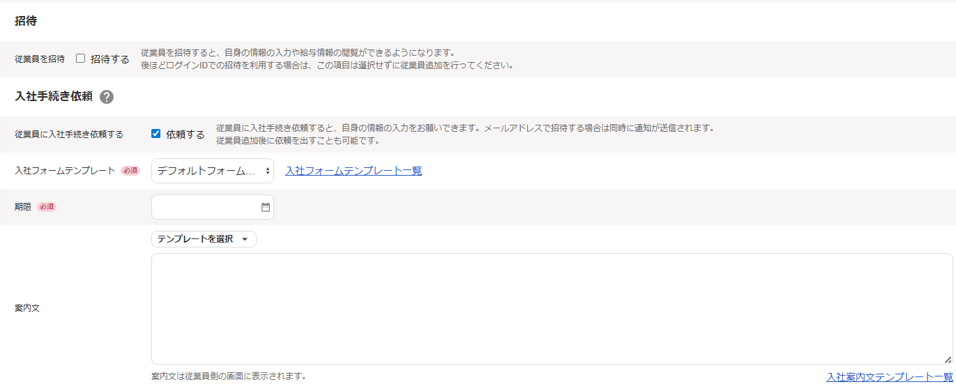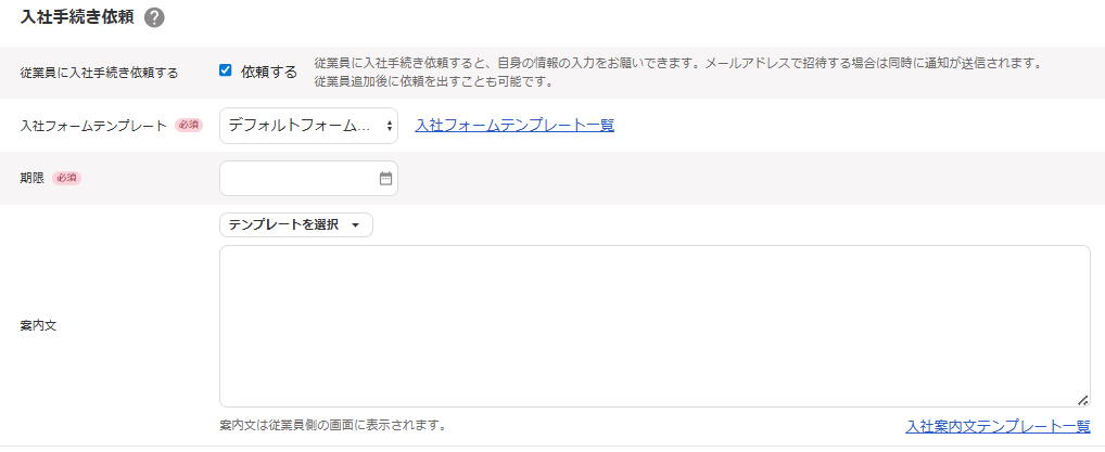 入社フォームテンプレート、期限、案内文の入力ができます。