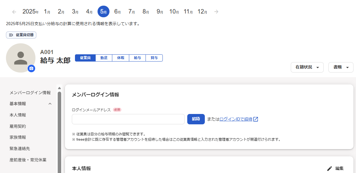 ※freeeでの給与計算項目で「給与計算を行う」に✔を入れていない場合、「招待」セクションと表示されます。