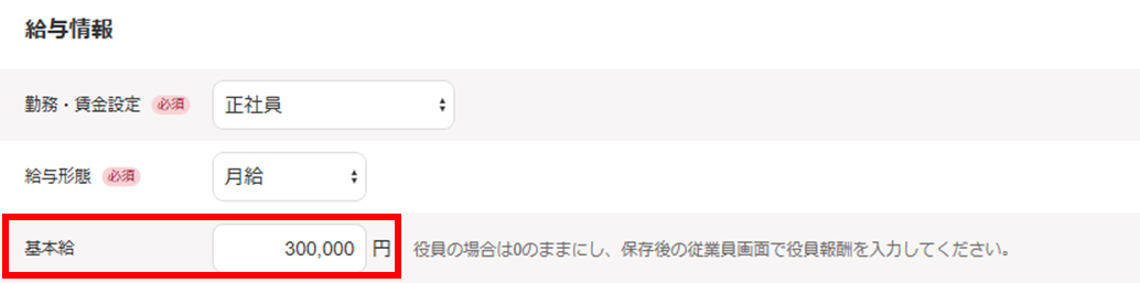 º 労働条件通知書の内容をもとに、基本給を月額で入力します。(例:300,000円)