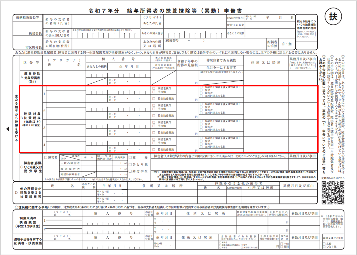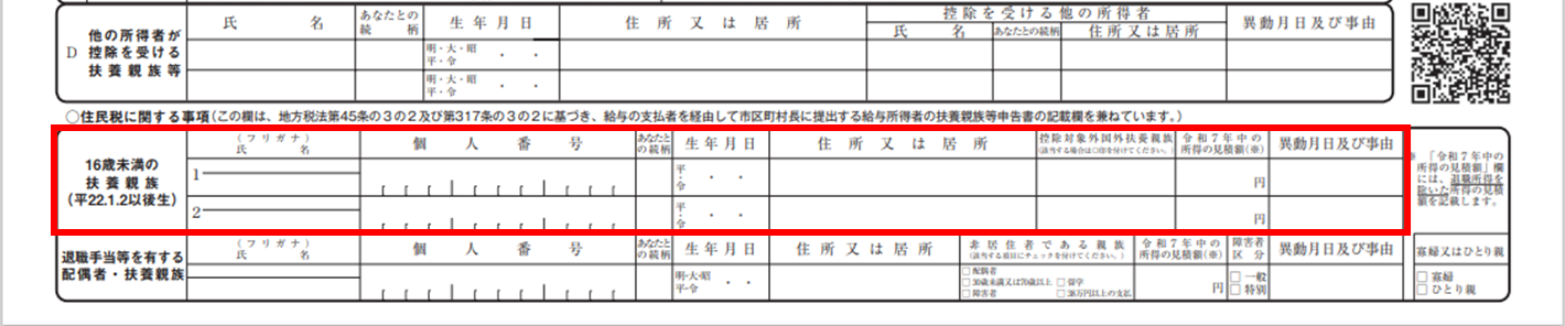 16歳未満の場合、扶養控除申告書の下部「16歳未満の扶養親族」欄に表示されます。