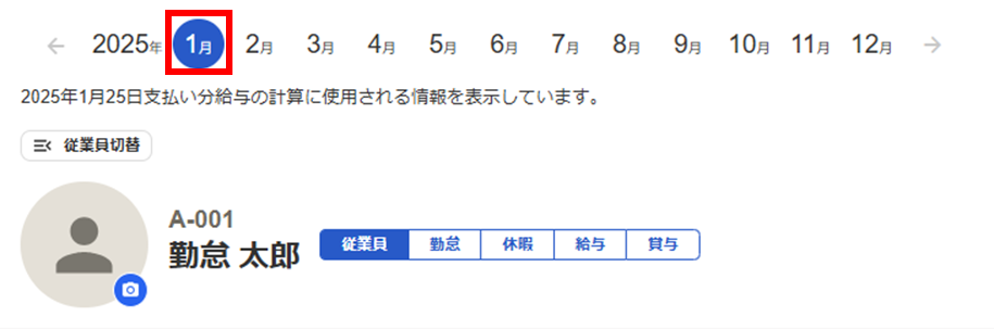 ❸「従業員詳細」画面上部の年月ナビゲーション(年月ナビ)で、情報を更新したい年月を選択します。