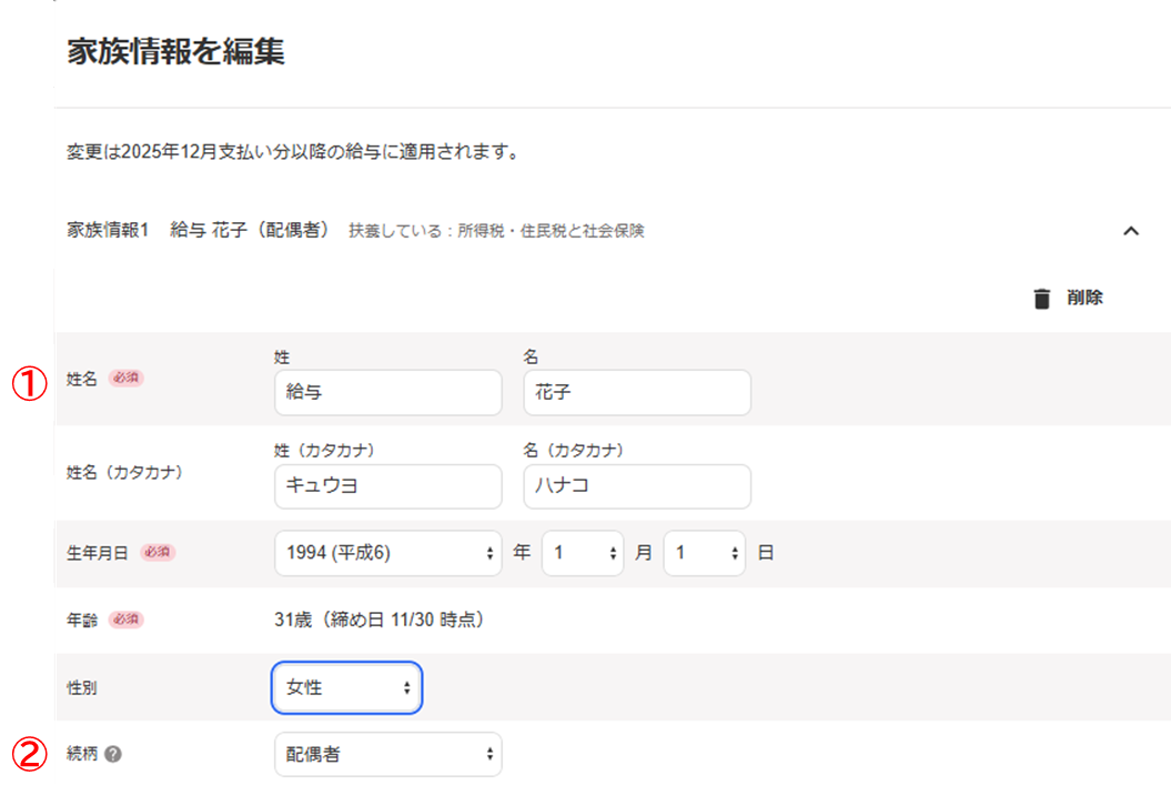 このページでは、freee人事労務の画面上から1従業員ずつ家族情報を更新する場合の手順をご案内します。