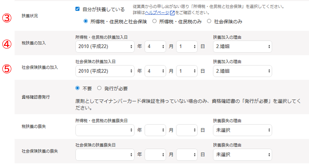 ※「税扶養の喪失」「社会保険扶養の喪失」は、扶養から外れた場合のみ同様に入力します。