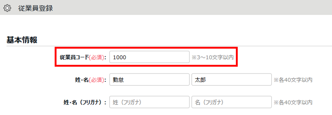 KING OF TIMEの従業員コード 「従業員設定」→「基本情報」
