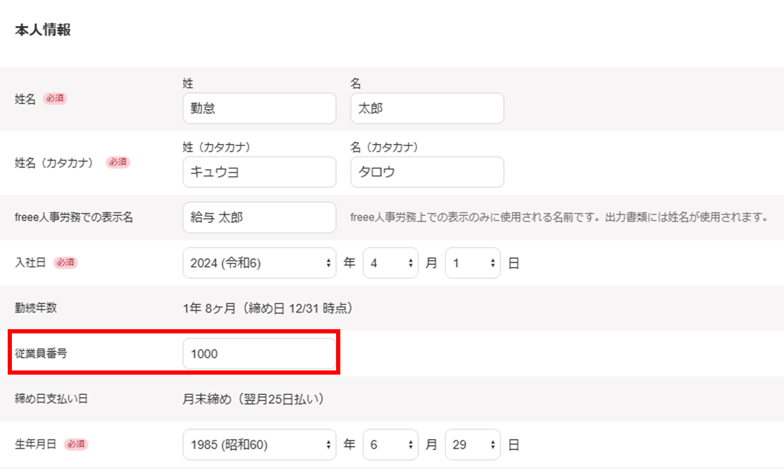 freee人事労務の従業員番号 「従業員情報」→「本人情報」