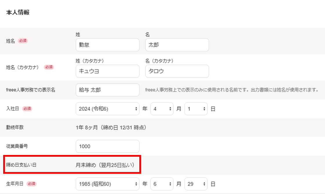 freee人事労務の締め日支払い日 「従業員情報」→「本人情報」