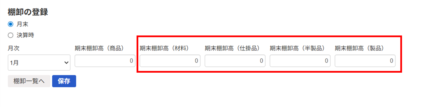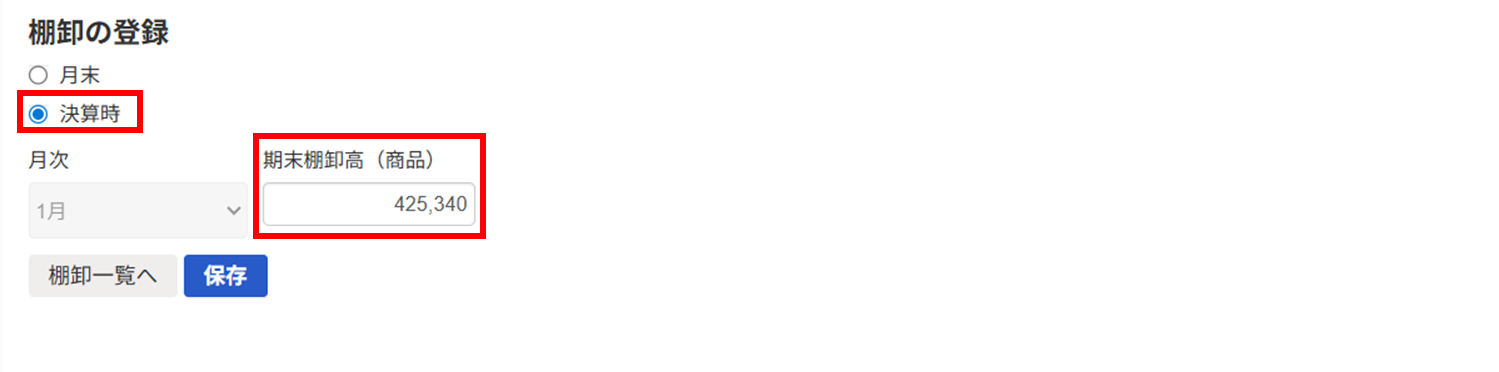 ❷ 「決算時」のラジオボックスを選んで棚卸金額を入力して「保存」をクリックします。